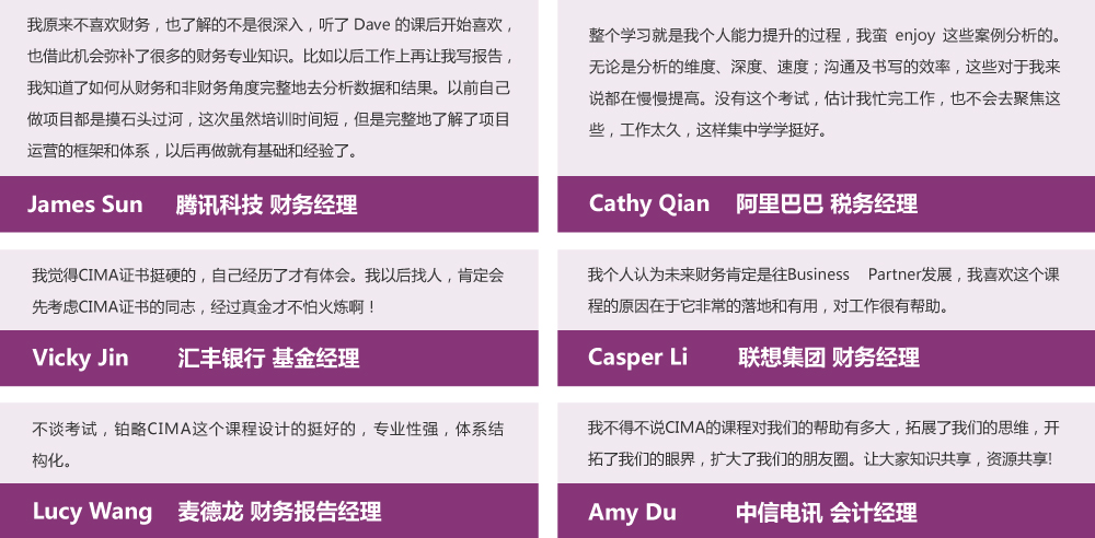 為了在加強基礎(chǔ)財務(wù)知識和技能,全面提升財務(wù)管理者的談判、戰(zhàn)略、管理技能,使之結(jié)識業(yè)內(nèi)最頂尖人才,往CFO甚至是CEO方向去努力, CIMA中國于2016年推出了CGMA全球管理會計精英認(rèn)證項目,并指定鉑略為全球獨家培訓(xùn)提供商。