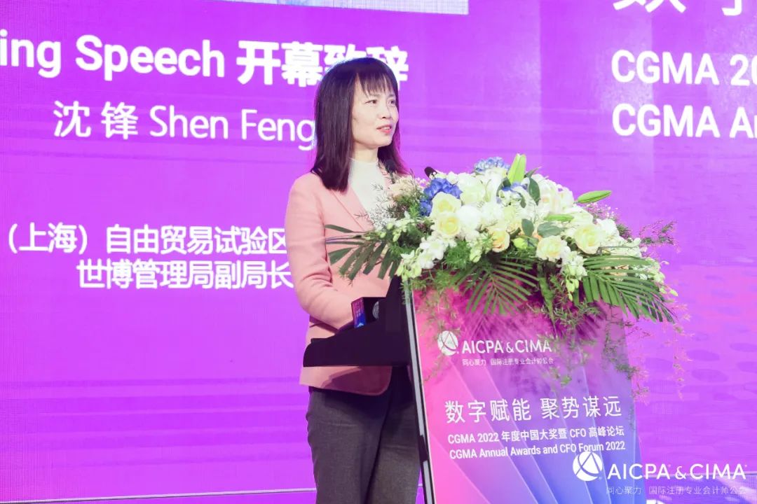 ▲中國(guó)(上海)自由貿(mào)易試驗(yàn)區(qū)管理委員會(huì)世博管理局副局長(zhǎng)沈鋒女士致開幕辭