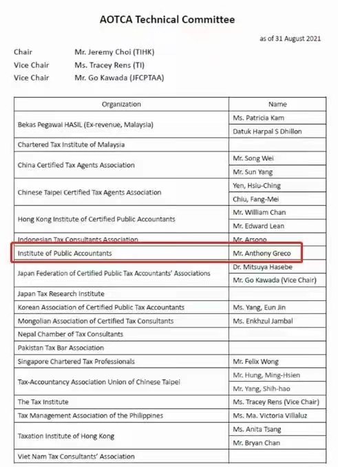 公共會計(jì)師協(xié)會集團(tuán)技術(shù)政策總經(jīng)理安東尼·格雷格(Anthony Greco)代表公共會計(jì)師協(xié)會(IPA)加入亞太稅務(wù)師聯(lián)合會 (AOTCA)技術(shù)委員會。